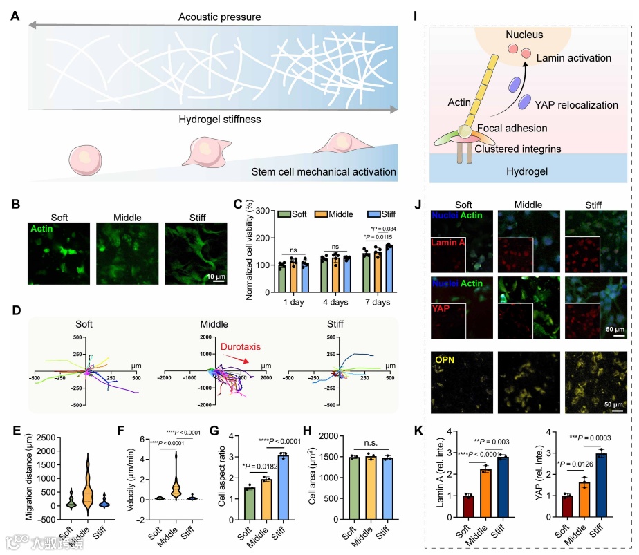 刚度较高的区域中,细胞核内Lamin A、YAP入核比例及成骨标志物OPN表达均升高; -
