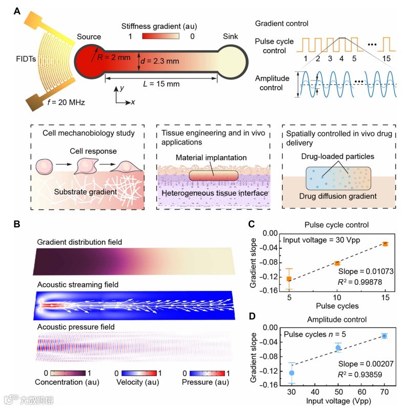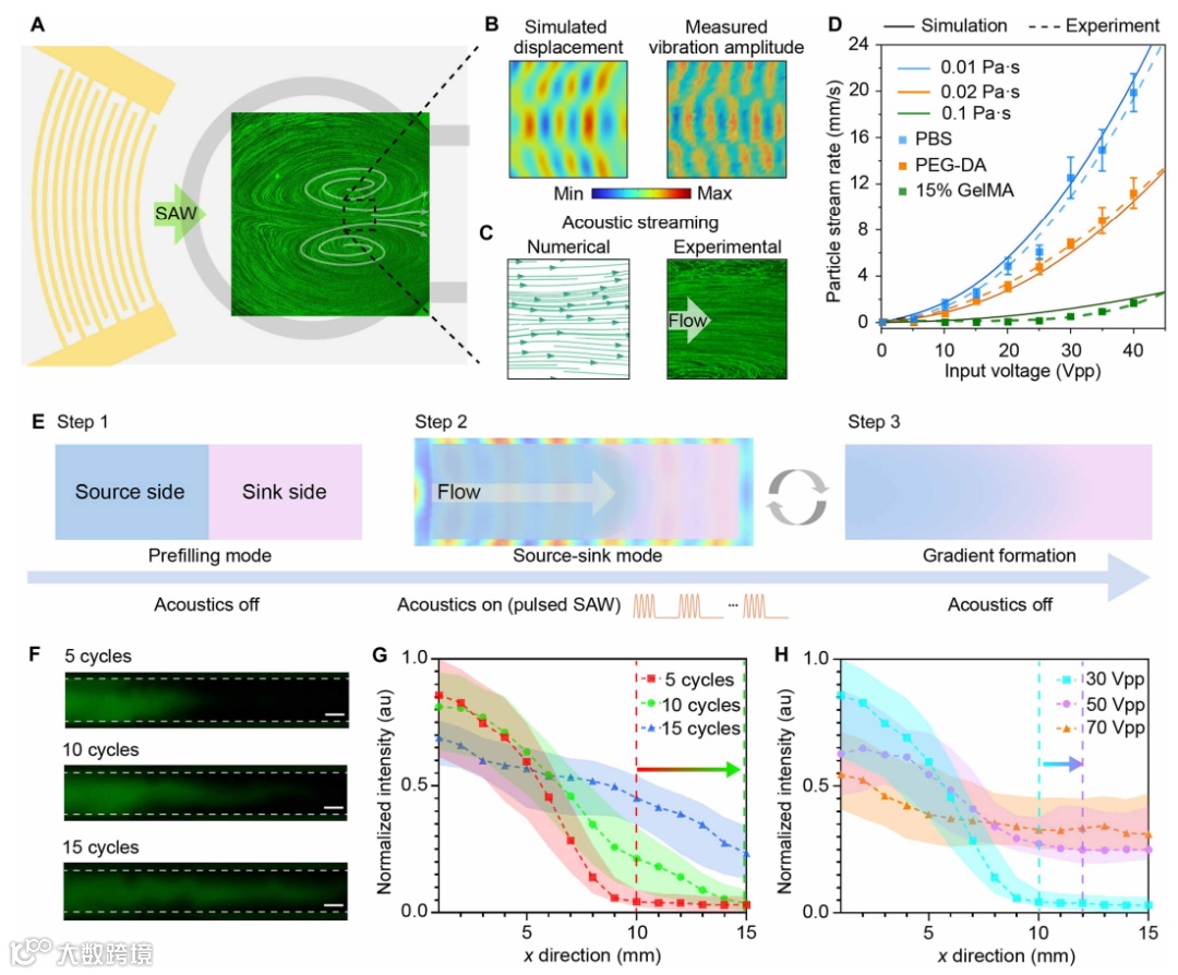 脉冲式声波激励:采用间歇性声波输入,而非连续激发。对于高粘弹性生物材料(如 GelMA 水凝胶),脉冲模式允许流体在声波间歇期充分松弛,避免非线性流变效应,从而保证梯度生成的可重复性与稳定性。