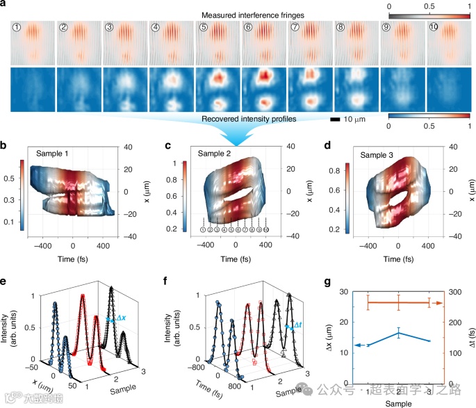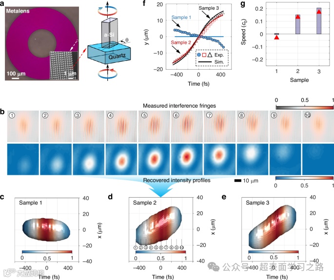 b 由样品2的超构透镜生成的前倾波包的干涉条纹测量结果(上)及其恢复的相对强度分布(下)。标号表示时间序列,可在(d)中对应。伪彩色分别表示测得条纹(上色标)与恢复轮廓(下色标)的归一化强度。