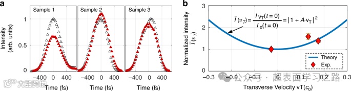 b 测得(菱形)与预测(曲线)的抛物关系:归一化峰值强度(对应(a)中的t=0)与横向移动速度之间的关系。