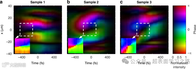 a – c 当不同样品生成的入射波包通过超表面光栅后,图3(b)–(d)对应的透射波包的相位与强度分布。为便于观察时空相位奇点,插图给出了白色虚线框内的纯相位分布。