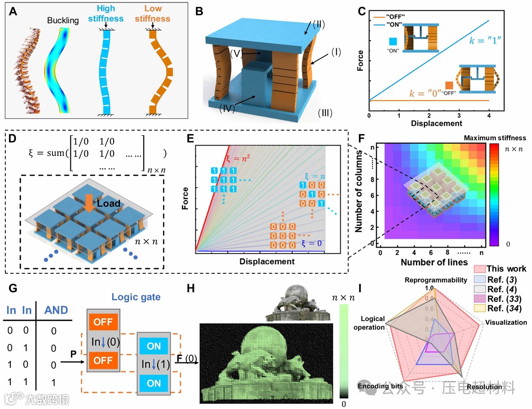 信息编码与可视化:通过控制单元状态调控整体刚度,并利用力致发光材料实现光学读出。