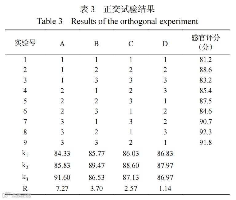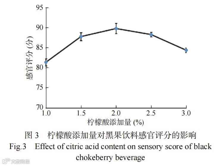 柠檬酸具有温和爽快的酸味,是一种良好的酸味剂。同时,添加柠檬酸能够调节饮料的pH呈酸性,有利于抑菌和产品的保存。由图3可知,当柠檬酸的添加量在1.5%~2.5%时,所调配的饮料酸味适口,口感清爽,感官评分在87.8~89.8分之间;当添加量高于2.5%时,饮料的酸味过于突出,糖酸比不协调,掩盖了其他的风味;当添加量低于1.5%时,则饮料的口味偏淡,感官评分较低。因此,2%柠檬酸添加范围控制在1.5%~2.5%为宜,要稍低于黑果腺肋花楸蓝莓复合饮料中0.08%的柠檬酸添加量,目的是更好地保持黑果腺肋花楸果汁原有的风味。因此,选择1.5%、2.0%、2.5%三个水平进行正交试验。