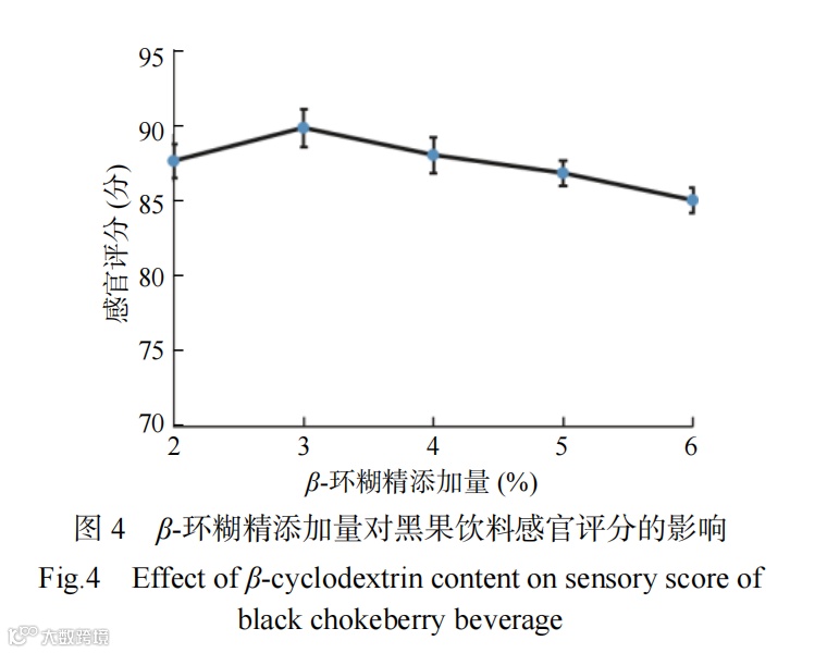 黑果腺肋花楸果汁的涩味较明显,在调配时会很大程度影响饮料的风味。β-环糊精常作为苦味物质的包埋剂,它易溶于水,可以在不影响果汁的营养成分情况下达到掩盖苦味的效果。由图4可知,当β-环糊精的添加量为3%左右时,感官评分可达89.8分,制得的饮料具有较高评分,说明β-环糊精的包埋作用能够有效减轻黑果腺肋花楸浸提汁的苦涩味。但是,当添加量高于4%时,饮料口感不好,感官评分开始下降。因此,β-环糊精的用量范围控制在2%~4%为宜,选择2%、3%、4%三个水平进行正交试验。