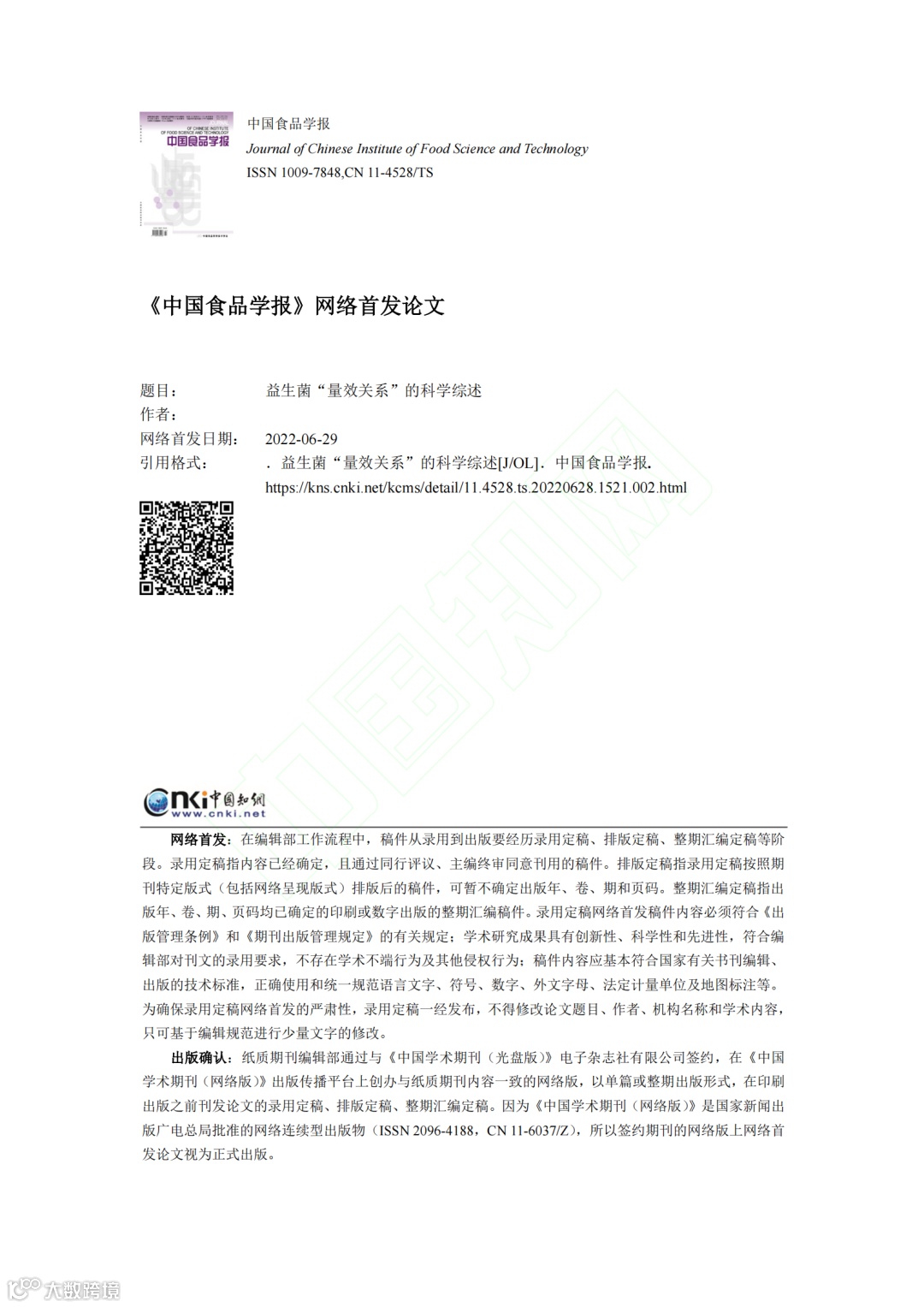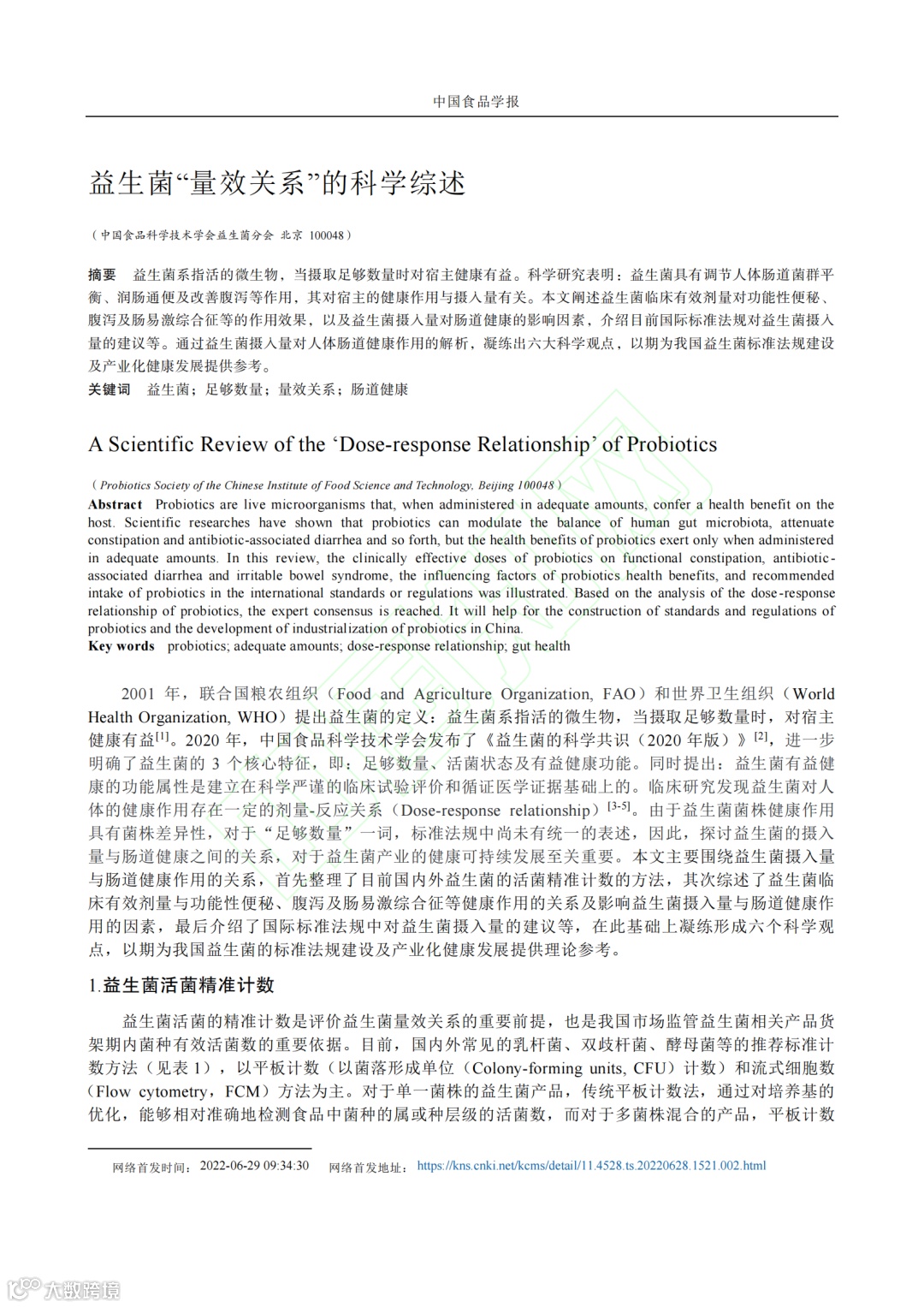益生菌对人体的健康作用存在一定的剂量—反应关系,但由于益生菌健康作用具有菌株差异性,在国内外标准法规中对益生菌的摄入量尚未有统一的要求。2021年,中国食品科学技术学会益生菌分会正式立项“益生菌‘量效关系’的科学综述”研究项目,以期为我国标准法规中益生菌的健康作用剂量指标及产业应用提供技术参考。经过近8个月的研究与完善,形成“益生菌‘量效关系’的科学综述”并于中国食品科学技术学会举办的第十七届益生菌与健康国际研讨会上正式发布。