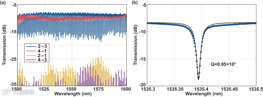 图2. 器件的线性透射光谱。(a) 不同端口间的透射光谱;(b) TE0模式谐振峰。
