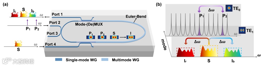 近年来,多模光子学的发展,为光学器件的设计打开了一个新的可用维度。研究团队通过模分复用技术,分离了不同空间模式的谐振条件,演示了基于模间布拉格散射四波混频过程的混频器。在该设计中,泵浦光始终占据基模TE0在微腔内谐振,从而提升非线性效率;信号和闲频光通过模式复用技术以高阶模式TE1仅单次通过谐振腔传输,不受谐振滤波的限制,原理如图1所示。此设计在提升非线性效率的同时支持波长透明,此外还继承了微腔短作用距离带来的相位匹配条件放宽的优势。实验结果表明,该设计在支持波长透明的前提下,相位匹配带宽达到了13nm(仿真预测带宽有望超越100nm),对比相同长度波导效率提升超过20dB。该芯片级混频器方案兼具高效率、宽带与波长透明特性,有望为经典及量子光信号处理开辟新路径。