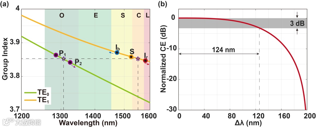 图4. 带宽优化。(a) TE0和TE1模式对应的群折射率曲线;(b) 优化相位匹配后的转换效率曲线。