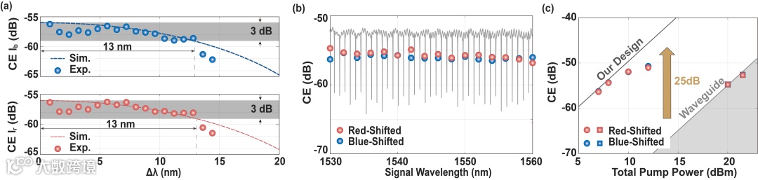 对于器件非线性方面的实验测试结果表明,当泵浦光和信号光均处于C波段内,器件支持13nm相位匹配带宽(图3(a))。在C波段内,改变信号光波长,转换效率无显著波动,表明支持波长透明(图3(b))。进一步与相同长度的波导对比,转换效率提升了25dB(图3(c)),目前器件的转换效率受到了硅材料在通信波段非线性吸收的影响。