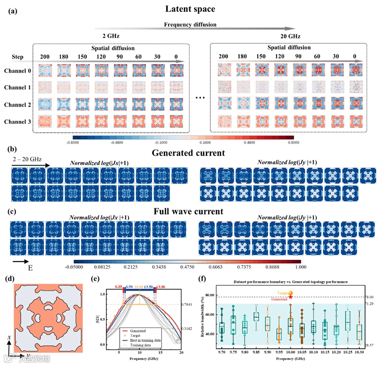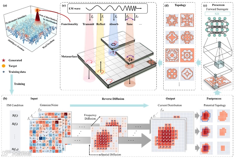研究团队提出了一种基于空间-频域动态电流扩散模型的设计框架(MetaAI,图1),采用视频生成模型从电磁响应谱反演电磁波与人工电磁结构的作用过程,以电流的空间-频域动态作为电磁响应和拓扑结构的中间桥梁,针对电磁响应分布内、外性能的响应需求,实现了单层和多层自由形式的结构快速设计,为多功能一体化研发提供了一种全新范式。