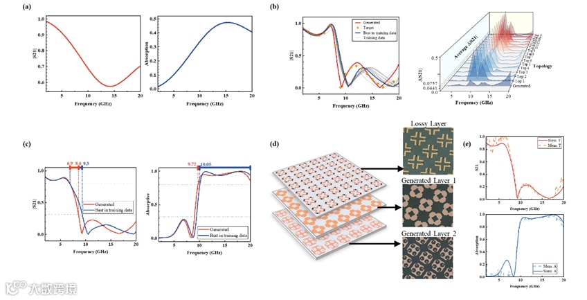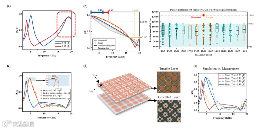 研究团队提出的空间-频域动态电流扩散模型如图2所示,通过融合电流的空间-频域数据,实现针对电磁特征分布内/外性能的多样化结构设计,基于正向代理模型快速获取可靠设计,并进行仿真验证。在单层设计案例(图3)中,基于分布外性能的条件输入,MetaAI重构对应空间-频域电流动态过程,得到的人工电磁结构空间-频域的电流动态过程与全波仿真结果吻合,而在相同约束条件下,性能超越了训练集边界。同时,通过与有源器件层联合,实现了可调人工电磁结构(图4)和吸-透一体多层结构(图5)的快速设计,实验结果验证了设计框架的有效性。