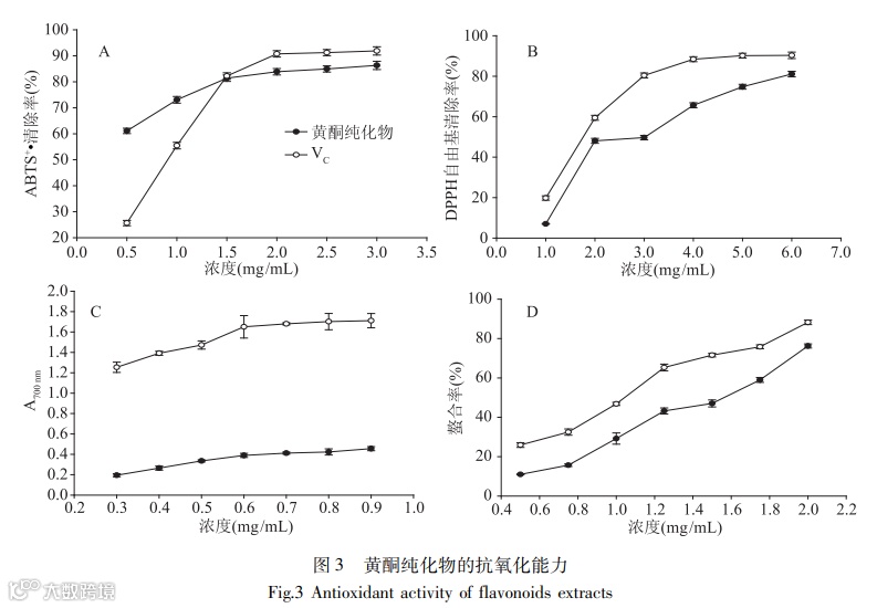 结果:薰衣草残渣中黄酮提取采用超声辅助提取工艺,运用单因素(提取时间、温度、乙醇浓度、料液比等)研究对黄酮提取的影响,提取溶剂乙醇与薰衣草残渣中黄酮的极性相似,利于黄酮类物质易于从残渣组织中释放,乙醇体积分数为70%具有最高的提取率;提取温度在 45 ℃时提取率达到最大值;超声波功率过低,超声波的能量低,分子运动慢,影响黄酮物质的提取,超过100 W后提取得率呈下降趋势,在100 W时提取率达到最大值;通过响应面实验进行优化,最佳工艺条件为提取时间92 min、乙醇浓度74%、提取温度48 ℃、料液比1:10 (w/v)。黄酮纯化物的总抗氧化能力随着黄酮浓度的增大而增大,当浓度在0.5~1.5 mg/mL之间时,总抗氧化能力随着浓度的增大显著增大,当浓度大于1.5 mg/mL后开始趋于平缓,在测定浓度范围内,总抗氧化能力达到80%以上,说明其抗氧化能力较强。黄酮纯化物清除DPPH自由基的能力随着黄酮浓度的增大而上升。当浓度达到6 mg/mL时清除率为81.11%。黄酮类化合物对铁离子具有很强的还原能力,它们提供的电子能够将Fe3+还原为Fe2+。还原力的大小和溶液的吸光度值呈正相关,吸光度值越高,样品的还原能力越强,螯合率也呈现相似趋势,抗氧化性越高。可见薰衣草黄酮具有较强抗氧化能力。