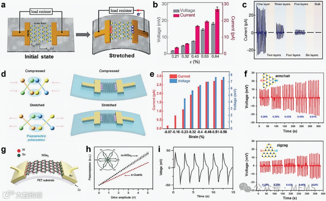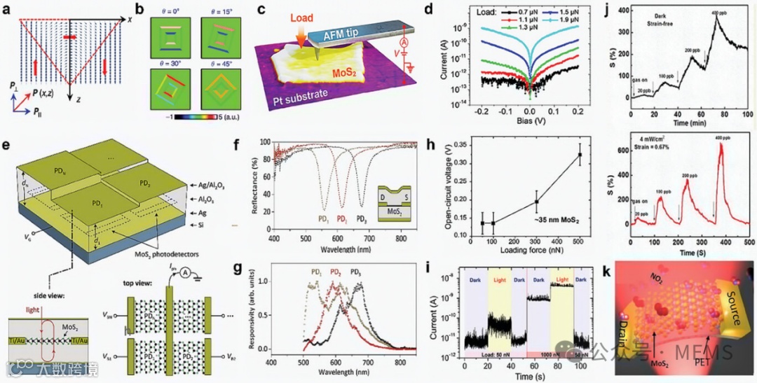MoS₂等二维材料的非中心对称结构确保了强大的压电效应,而其高载流子迁移率和直接带隙则是场效应晶体管和光电器件应用(例如光电探测器/传感器和光伏器件)的理想选择。此外,通过应变或异质结构调整带隙和电子特性的能力增强了二维材料的多功能性。这些特性与化学气相沉积(CVD)等可规模化制备方法相结合,使二维材料成为下一代压电电子与光电子器件的潜力候选者,为自供电传感器、能量收集器及先进光子学器件带来了新机遇。
