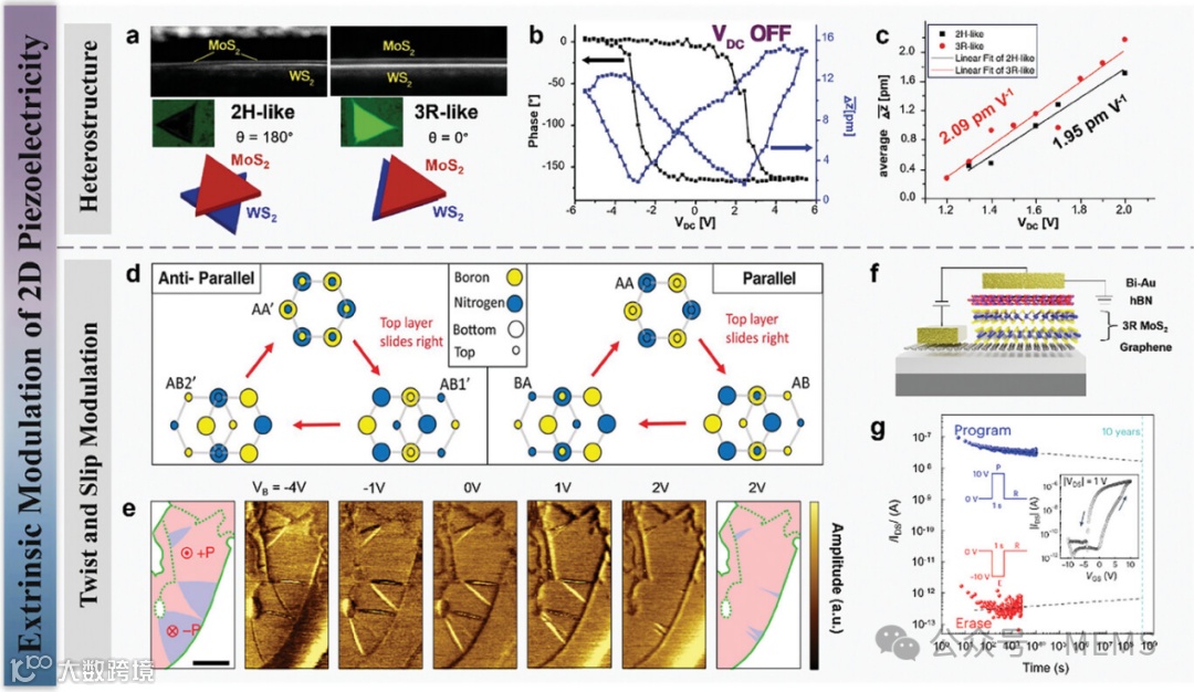 众所周知,赋予二维材料铁电性,同样能使其具备面外压电特性。与传统三维铁电材料不同,原子级厚度的二维材料可以实现超薄器件尺寸。它们表面光滑且无悬挂键,使得基于范德华力的异质结自由构建及器件集成成为可能。除异质结外,扭曲和滑移铁电是赋予二维材料铁电性能的另一种方法。此外,通过修饰衬底向二维材料引入应力,不仅能调控其压电特性,还可通过调节带隙改善其光电响应,这在压电电子学和压电光电子学领域具有重要意义。