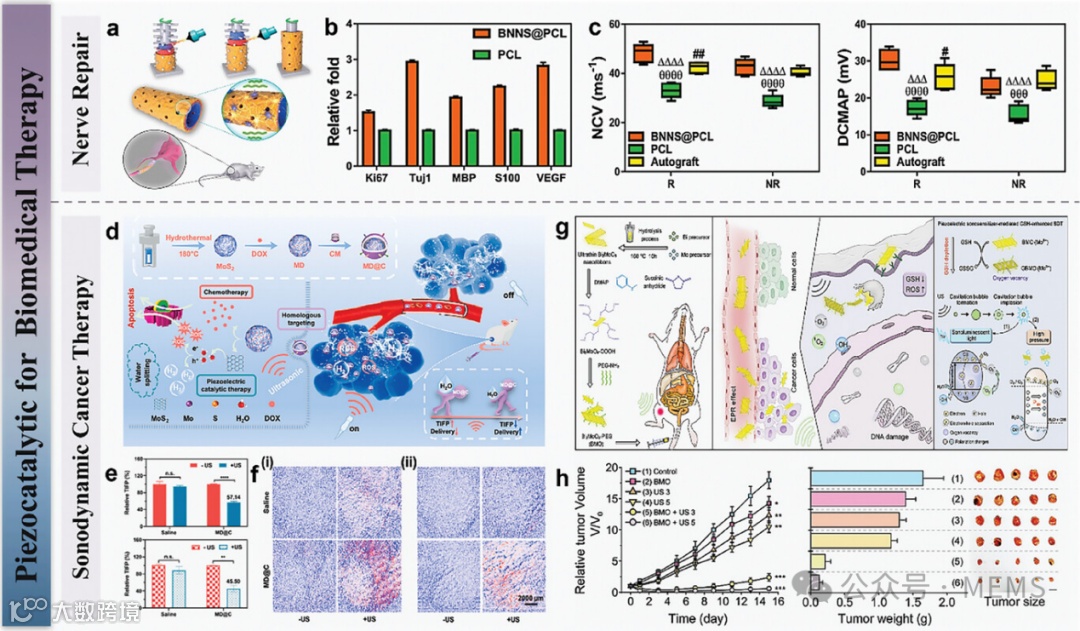 二维材料因其柔软性和压电性能而被广泛用作生物医疗领域的应变传感器。通过将柔性压电二维材料制成可穿戴柔性传感器,可以通过感知脉搏或心跳来实现对人体健康的实时监测。此外,二维材料具有良好的生物相容性,广泛应用于植入式生物医学领域。一方面,研究人员可以利用二维材料的压电效应来监测体内健康状况;一方面,二维材料具有良好的压电催化效应。当施加外部超声波时,二维压电材料会收集振动能量以引起变形,从而产生电流以催化活性氧(ROS)的产生。ROS可以破坏癌症细胞的内部结构,从而实现安全、高效、无痛的治疗。