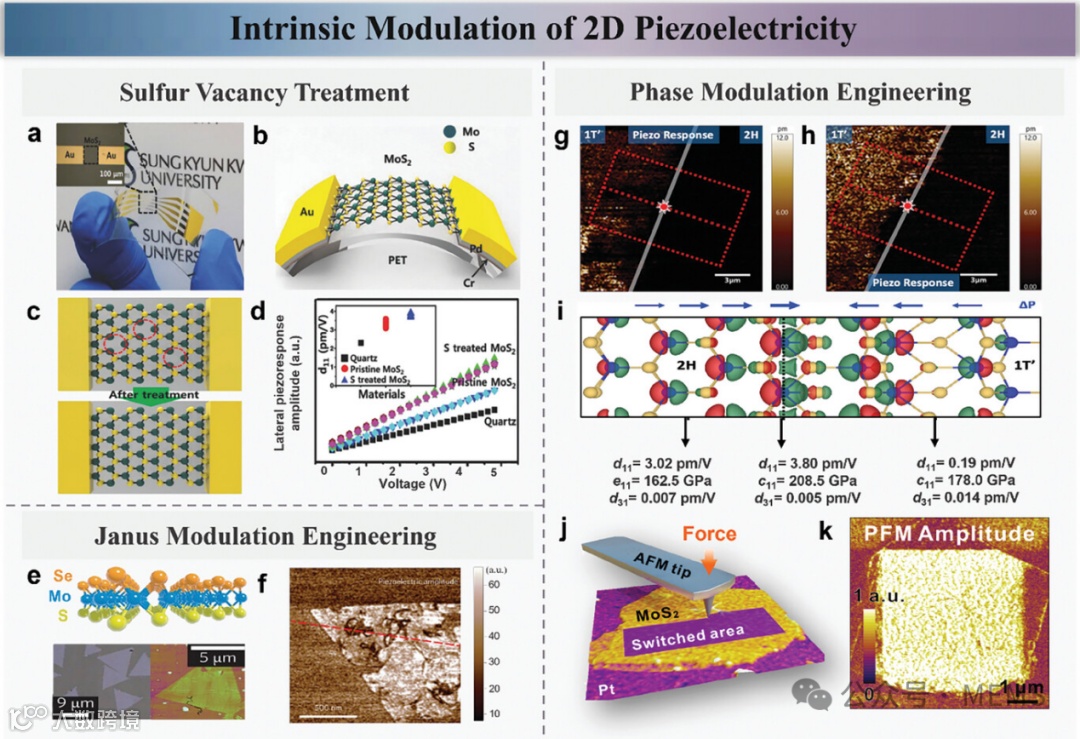在压电电子学和压电光电子学领域,材料的压电特性至关重要,因为其直接影响器件的能量转换效率、传感灵敏度和信号处理能力。通过调控MoS₂、MoTe₂等二维材料的结构和缺陷,研究人员已经确定了几种提高压电系数的有效方法。这些方法包括硫空位钝化、相变调节、引入Janus结构和界面效应增强,均能显著提高压电响应。这些进步不仅提高了能量收集和转换的效率,还增强了传感器件的灵敏度和可靠性。