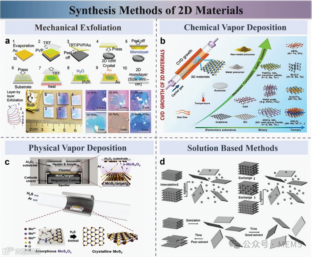 二维材料的合成方法主要包括机械剥离法、化学气相沉积法(CVD)、物理气相沉积法(PVD)、以及溶液法。