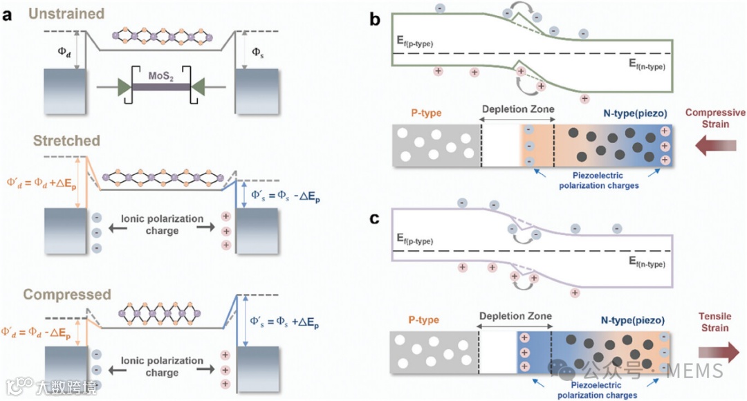 压电电子学和压电光电子学是令人兴奋的新领域,它们利用压电材料的独特性质来改进电子和光电子器件。在压电电子学中,关键思想是利用机械应变产生的电势(称为压电势)来调控电荷在材料界面(例如金属和半导体(M-S)接触界面或p-n结)的迁移。可以将这种压电势看作一个开关或“门”,能够通过开合来调节电子流。同样,压电光电子学利用压电势来影响光生载流子的产生、分离和传输,从而优化光电探测器/传感器、太阳能电池和压电光电晶体管的性能。