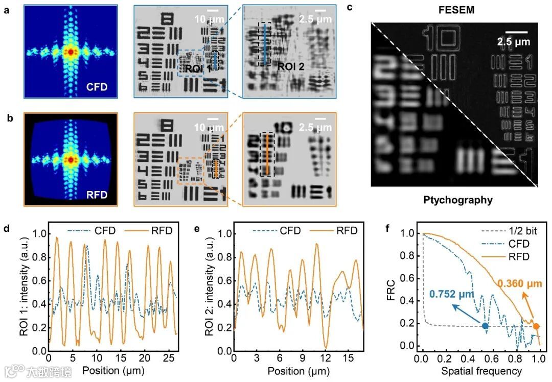 基于上述成像框架,本研究在CDI中验证了完美传递函数的理论可行性,并成功将成像分辨率推至阿贝衍射极限。特别是在无透镜叠层衍射成像中,研究团队于接近0.9的超高NA系统下,将成像因子 k 优化至0.501,逼近了阿贝分辨率极限。凭借超高NA与逼近阿贝极限的k因子,最终在CDI系统中实现了0.57 λ的近半波长级横向分辨率,研究结果如图3所示。