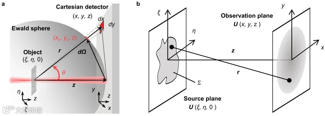 图1:自由空间光场传播:(a) 埃瓦尔德球效应;(b) 瑞利-索末菲衍射的传播几何示意