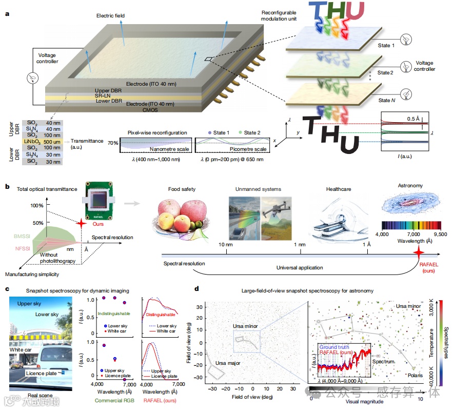 图1a核心架构:一块可由电压调控光谱响应的随机结构铌酸锂薄膜,直接集成在CMOS传感器上。图1b RAFAEL同时实现了超高透射率(>70%)和亚埃级分辨率,远超现有技术。图1c和1d分别展示了其在动态场景识别和大规模天文光谱普查中的强大应用。RAFAEL能单次快照捕捉数千颗恒星的光谱。