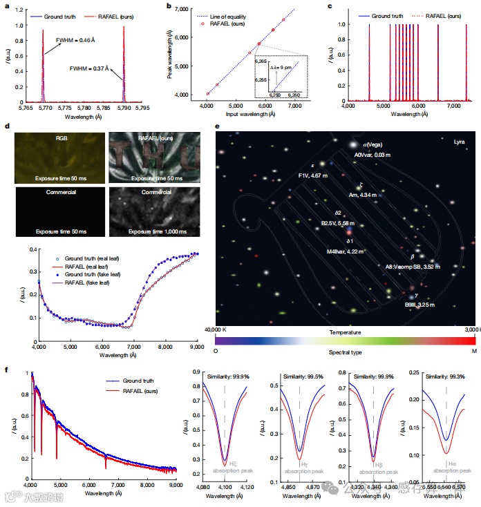 图4a, 4b, 4c通过分辨汞灯的精细原子光谱,实验性地证明了其亚埃级的分辨率和皮米级的精度。图4d在材料识别实验中,以短得多的曝光时间获得了远比商业光谱仪更明亮、更清晰的图像,并能轻松区分颜色相近的真假树叶。图4e和4f是其在天文学上的展示,成功获取了天琴座中大量恒星的光谱,对织女星的光谱分析结果与专业天文数据吻合度高达99%以上,验证了其精度和可靠性。