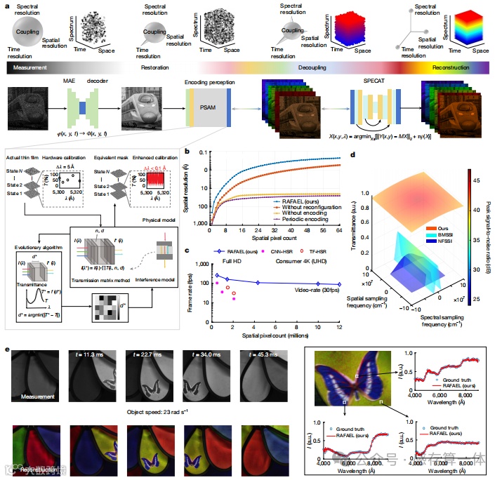 介绍了将硬件采集的压缩数据还原为高维光谱图像的强大算法(PSAIR)。图3a展示了算法流程,融合了光学物理模型与人工智能(如Transformer),实现了从测量、恢复到重建的全过程。图3b揭示了分辨率的提升路径:空间随机结构将分辨率提升了两个数量级,而电压可重构性则最终使其突破到亚埃级。图3c和3d证明了该算法的高效性(可达88 fps)和重建结果的卓越质量。图3e通过对高速旋转风车的动态实验,验证了整个系统在真实场景下的高性能表现。