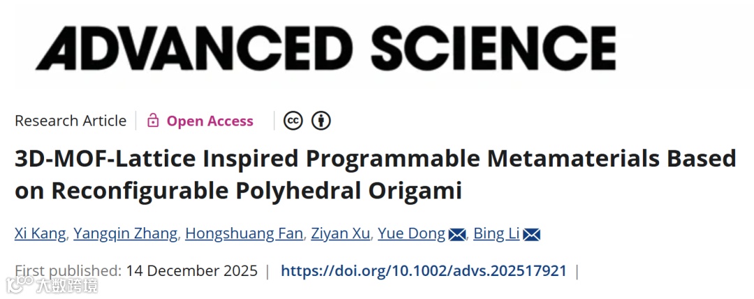文章信息:X. Kang, Y. Zhang, H. Fan, Z. Xu, Y. Dong, and B. Li, “ 3D-MOF-Lattice Inspired Programmable Metamaterials Based on Reconfigurable Polyhedral Origami.” Adv. Sci. (2025): e17921.