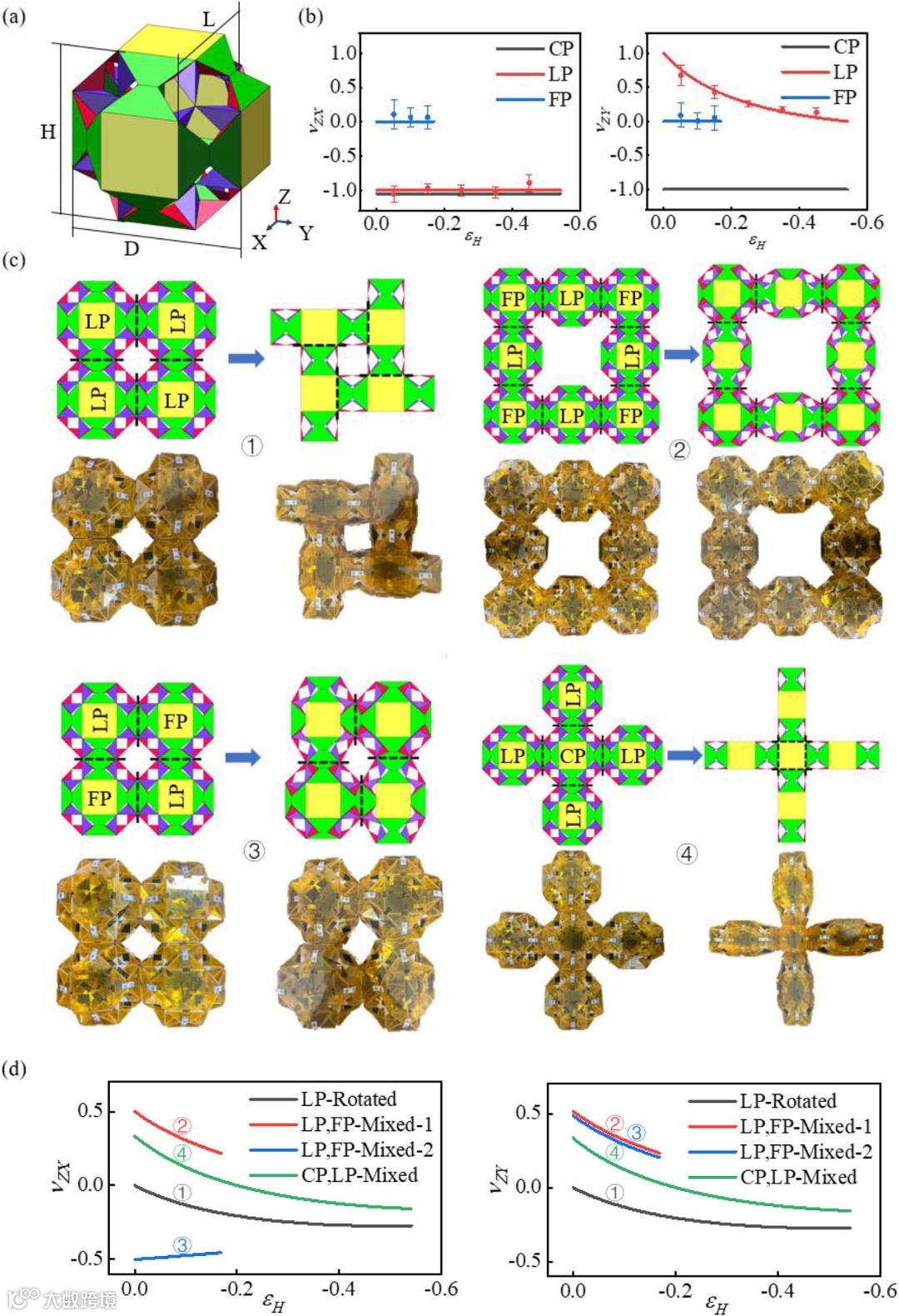 可编程的宏观材料:通过组合基本模块,能够精确设计和调控整个超材料网络的泊松比(在-0.5至1范围内连续可调)和变形模式。