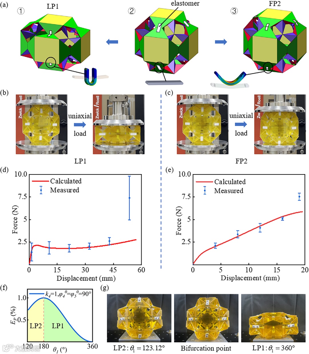 模块化与可编程策略:通过在不同折痕处添加约束和弹性体,衍生出三种具有不同运动路径(CP, LP, FP)和力学特性的基本模块。这些模块可作为“材料像素”,通过不同的连接与网络化方式组装,构建出整体性能可编程的超材料。