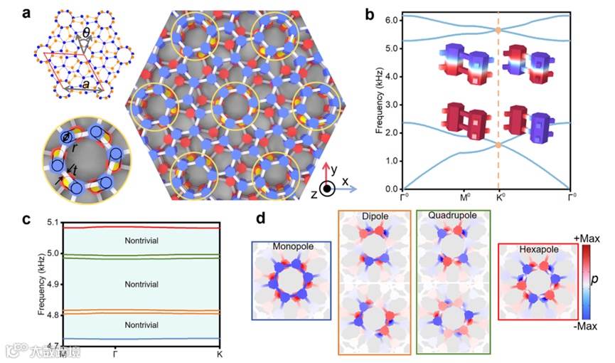 近日,华中科技大学的祝雪丰教授、彭玉桂副教授研究团队提出了一种通过在扭转莫尔超晶格中引入周期性强局域共振来实现全平带高阶拓扑绝缘体的新机制。研究以21.78°扭转角的声学石墨烯双层结构为平台,通过在特定位置引入层间耦合以形成竞争性相互作用,成功获得了具有驻波特性的全平带结构。定量分析表明,强层间耦合是促成平带形成与拓扑相变的关键因素。该声学扭转莫尔超晶格展现出六个平带及三个拓扑非平凡的带隙,其本征模式涵盖了从单极子到六极子的完整米氏共振。实验上通过三维打印样品验证了体态、边态、角态以及三维铰链态的存在,与仿真结果高度一致。该工作不仅为构建声学全平带拓扑系统提供了一条简洁有效的路径,深化了对扭转莫尔超晶格物理的理解,而且所展示的频率选择传输、高Q谐振及多维拓扑态控制特性,在声能收集、传感、波束分离及滤波等领域具有潜在的应用前景。本研究成果发表于《Advanced Materials》。(刘梦洋)