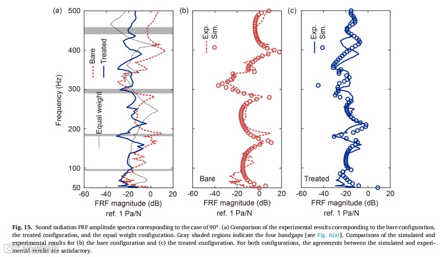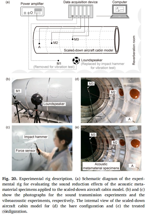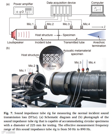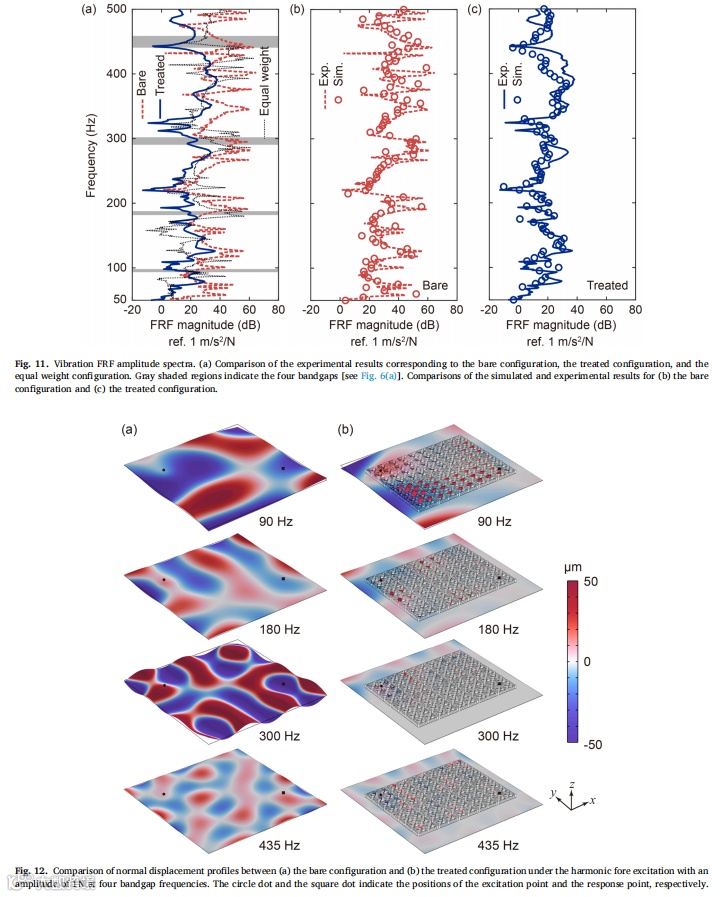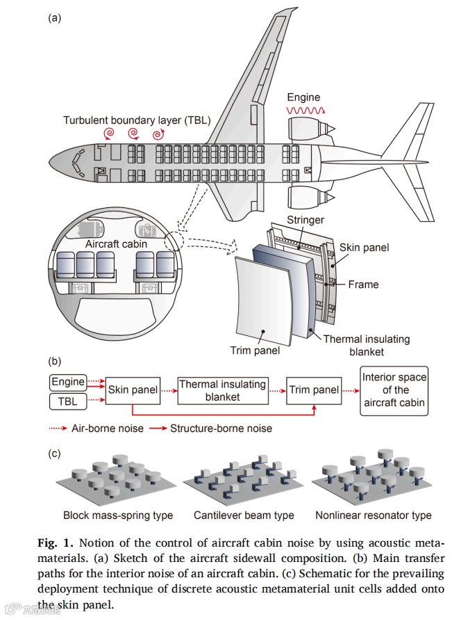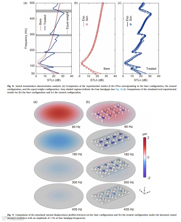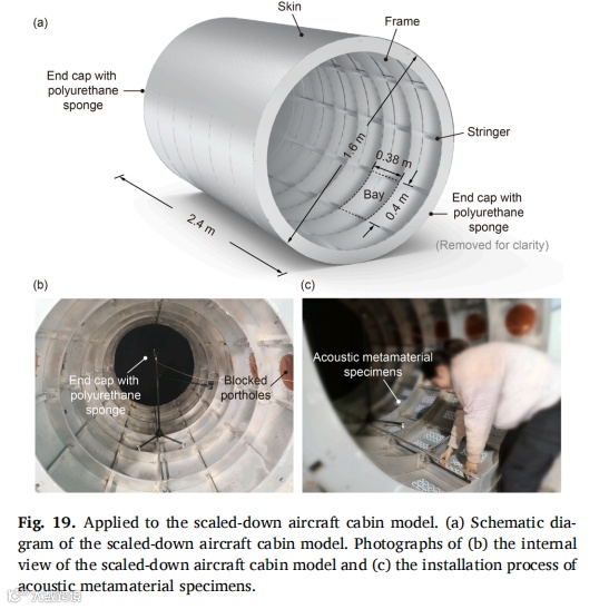 受乐高积木启发,我们设计出一类实用型声学超材料,并采用工业级注塑成型技术成功实现规模化生产。静态力学测试表明,制备的声学超材料试件能承受足够的拉压载荷,确保在实际应用中不发生断裂或坍塌。通过理论分析、数值模拟与实验验证相结合的系统研究方法,揭示了该声学超材料的动态力学特性。研究结果显示,在小尺寸简单波场环境中,该声学超材料试件能在500Hz以下的四个带隙频段有效发挥降噪作用。最后通过分别施加声压激励与点力激励,在缩比飞机舱段模型中实验评估了超材料试件的降噪效果,证实其在特定带隙频率对声传输、振动传递及声辐射的抑制能力。值得注意的是,在带隙外频率区间也观测到显著衰减现象,这为后续研究大型复杂波场环境中局部动态力学特性对全局特性的影响机制提供了新方向。未来研究可探索将压电材料/形状记忆合金等可调元件集成至超材料结构中实现共振频率主动调控,或采用高阻尼复合材料进一步提升降噪性能。由于成功解决了规模化制造与便捷部署两大核心难题,本研究设计的声学超材料可为车辆、建筑及家电等领域的降噪超材料开发提供重要参考。 |