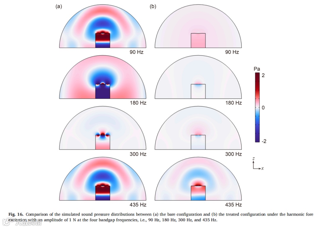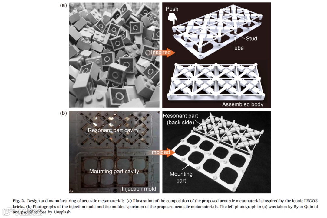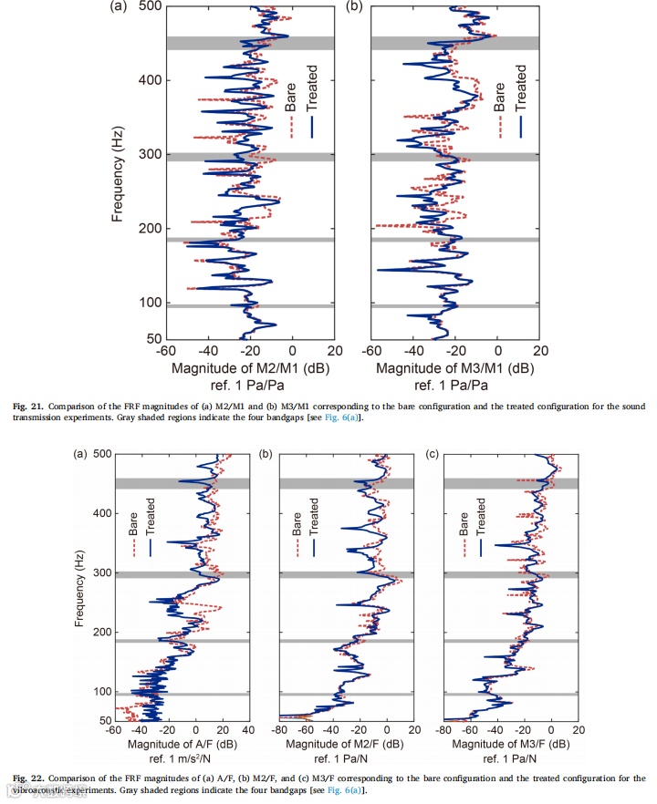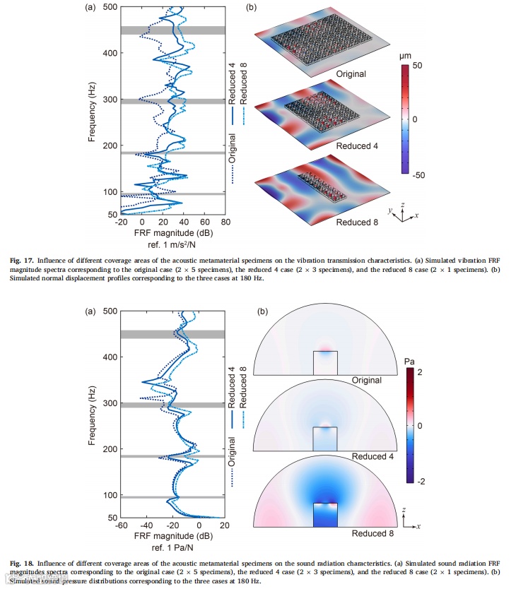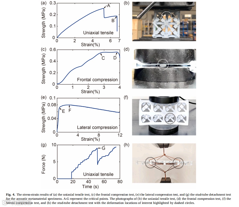 受乐高积木启发,我们设计出一类实用型声学超材料,并采用工业级注塑成型技术成功实现规模化生产。静态力学测试表明,制备的声学超材料试件能承受足够的拉压载荷,确保在实际应用中不发生断裂或坍塌。通过理论分析、数值模拟与实验验证相结合的系统研究方法,揭示了该声学超材料的动态力学特性。研究结果显示,在小尺寸简单波场环境中,该声学超材料试件能在500Hz以下的四个带隙频段有效发挥降噪作用。最后通过分别施加声压激励与点力激励,在缩比飞机舱段模型中实验评估了超材料试件的降噪效果,证实其在特定带隙频率对声传输、振动传递及声辐射的抑制能力。值得注意的是,在带隙外频率区间也观测到显著衰减现象,这为后续研究大型复杂波场环境中局部动态力学特性对全局特性的影响机制提供了新方向。未来研究可探索将压电材料/形状记忆合金等可调元件集成至超材料结构中实现共振频率主动调控,或采用高阻尼复合材料进一步提升降噪性能。由于成功解决了规模化制造与便捷部署两大核心难题,本研究设计的声学超材料可为车辆、建筑及家电等领域的降噪超材料开发提供重要参考。 |