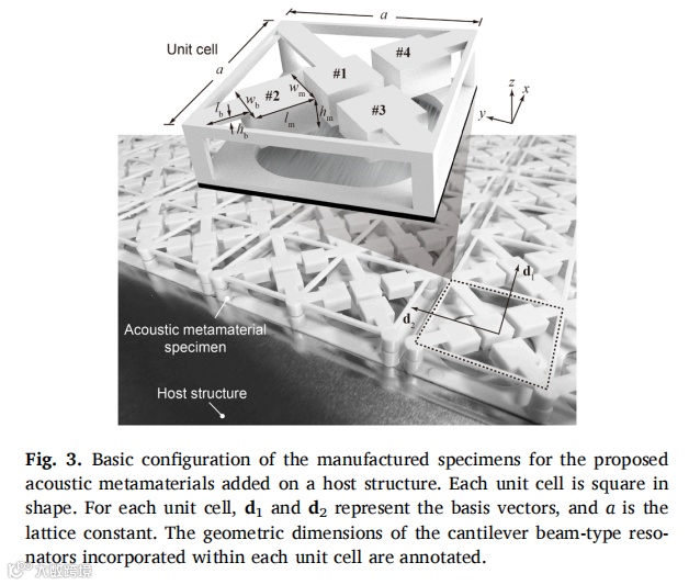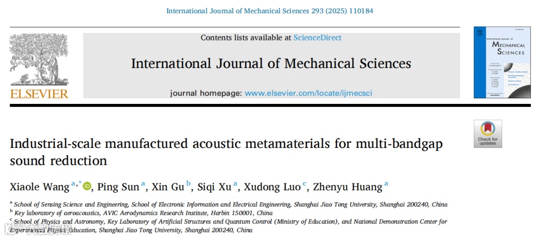 实现规模化制造与便捷部署是推动声学超材料广泛应用的关键基石。本研究致力于解决当前声学超材料在制造与实施层面面临的技术挑战。提出的声学超材料采用螺柱-套管耦合结构,由共振单元与安装基体两部分组装构成。共振单元通过细长连杆连接多个单胞,每个单胞包含四个具有不同几何参数的悬臂梁式谐振器,用于生成多重带隙。安装基体背面采用平整宽阔的设计,便于在主体结构表面快速牢固安装。采用丙烯腈-丁二烯-苯乙烯共聚物材料,通过注塑成型技术实现声学超材料试件的规模化生产。通过拉伸与压缩承载力测试对试件的静态力学特性进行实验量化,并结合理论分析、数值模拟与实验验证揭示了动态力学特性的内在物理机制。最后在缩比飞机舱段模型中开展部署测试,验证其在大型复杂波场环境中的降噪效果。研究发现该声学超材料在500 Hz以下呈现四个完整的局域共振带隙,可实现气载声与结构声的多频段协同控制。这种多带隙声学超材料的创新设计,结合注塑成型工艺实现的工业化量产原型,标志着声学超材料向商业化应用迈出了重要一步。 |