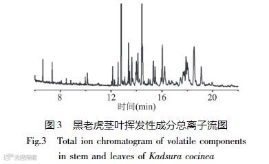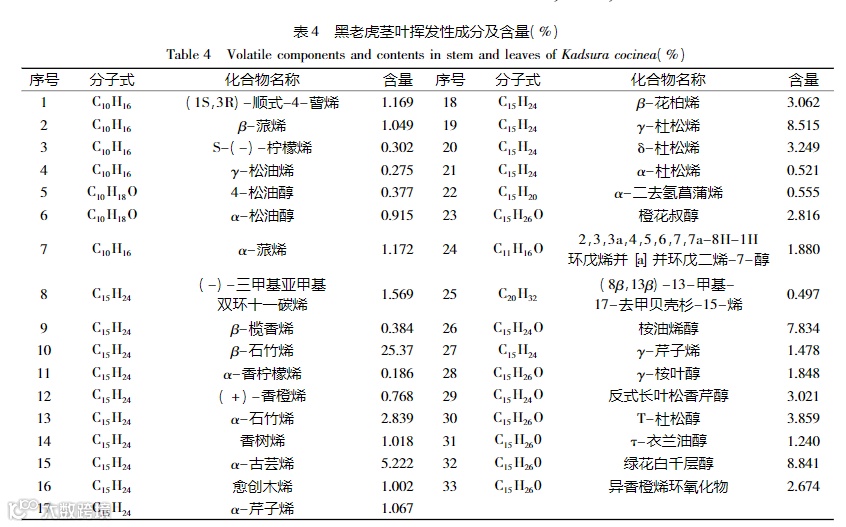 黑老虎茎叶出油率为0.798%,经与NIST质谱库进行比对检索,共鉴定出33个挥发性成分(具体结果见表4),主要是萜烯类化合物(相对含量为64.70%)和醇类化合物(相对含量为32.63%),萜烯类主要有石竹烯、杜松烯、古芸烯、花柏烯、蒎烯等,醇类主要有绿花白千层醇、桉油烯醇、杜松醇、橙花叔醇等。杨艳等从黑老虎茎、叶中分别鉴定出54种和36种挥发性成分,主要都是烯类和醇类化合物,与本文的结果一致,但化合物数量及单个化合物含量差异较大,这可能是由于产地环境、样品处理方法等因素不同造成。茎叶中的挥发性成分与已有文献报道的根部挥发性成分相似,都是以烯类化合物为主,其相对含量均超过50%。这些烯类化合物大部分具有药用和保健功效,如石竹烯具有一定的平喘作用,对皮肤炎症具有较好的治疗效果,也是治疗老年慢性支气管炎药物的有效成分之一;蒎烯具有镇咳、祛痰和抗真菌作用,还可用于合成香茅醛、橙花醇、萜烯树脂等重要香料。