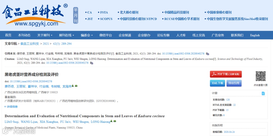 黑老虎(Kadsura cocinea) 是五味子科南五味子属的常绿木质藤本野生植物,别名布福娜、冷饭团、大叶南五味等,是一种常用民族药,常以根及藤茎入药。现代医学研究发现黑老虎根及藤茎具有抗炎、抗肿瘤、抗氧化、抗凝血、保肝等功效。除药用部位外,黑老虎的其它部位也具有应用价值。黑老虎果肉香甜,富含维生素、氨基酸、矿物质等营养成分,营养与药用价值较高,是一种极具开发潜力的珍稀野生水果。果皮含有可作为天然色素的花色素苷及抗氧化成分,对伤寒沙门氏菌也具有显著抑制作用。黑老虎籽含有丰富的氨基酸、脂肪酸、皂苷、维生素及矿物质,可开发为具有抗氧化、降血压、降血脂等功能的保健食品。国内外主要对黑老虎根茎和果实进行开发利用研究,而对茎叶的研究和开发鲜有报道,一般将其作为废弃物丢弃。Rehman等报道黑老虎叶对湿疹有治疗效果; 杨艳等对黑老虎茎和叶的挥发性成分及抗氧化活性进行分析,发现茎和叶在抗氧化活性方面都比根部更具利用优势;李亚军等发现黑老虎叶总黄酮具有一定的清除 DPPH 自由基、超氧阴离子自由基及羟自由基的能力。