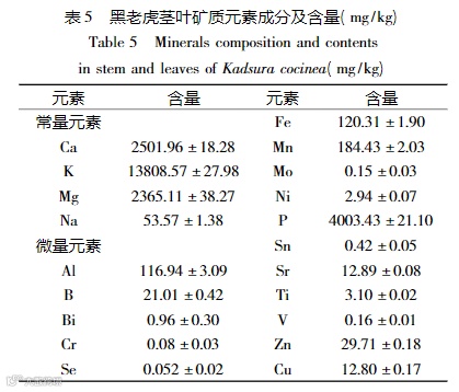 矿质元素是构成人体组织和保证人体正常生理功能所必需的元素,包括常量元素和微量元素。由表5可知,黑老虎茎叶含有丰富的矿质元素,常量元素中钾元素含量最高,其次为钙、镁,而钠元素含量最低,呈现高钾低钠的特点,作为食物有利于预防或减缓高血压症状。微量元素中,磷、锰、铁、铝、锌元素含量较高,分别为4003.43、184.43、120.31、116.94、29.71mg/kg。由于锌、铜、铁、锰微量元素的理化性质相似,当锌铜比值大于10及锌铁比值大于1时,其生物学功能通常发生拮抗现象[28]。黑老虎茎叶的锌铜比值和锌铁比值分别为2.32和0.25,二者比值均较为合理,说明其微量元素易于被人体吸收。本文还对黑老虎茎叶中砷、汞、铅、镉重金属进行测定,含量分别为0.037、0.007、0.291、0.071mg/kg,均远低于GB2762-2017《食品安全国家标准食品中污染物限量》对重金属的限量指标[29]。