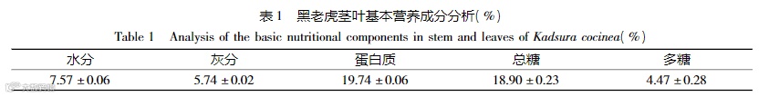 表1列出了黑老虎茎叶的基本营养成分,结果显示水分含量为7.57%;灰分含量为5.74%;蛋白质含量为19.74%,约为大多数禾谷类食品蛋白质含量的2~3倍;总糖含量为18.90%,高于黑老虎果肉和果皮的总糖含量;多糖含量为4.47%,高于黑老虎果核多糖含量和黑老虎籽多糖含量。蛋白质在营养成分中占重要地位,多糖又是生物体内重要的大分子物质,具有多种生物活性。由此可见,黑老虎茎叶蛋白质、总糖及多糖含量丰富,营养价值较高并具有一定的生物活性功能。