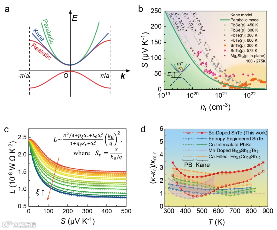 精准描述电子在外部电场和热场作用下的输运行为,是材料科学领域的一个核心科学问题。对功能半导体材料而言,能带论是描述其电子输运行为的最基础理论。通过分析电子能量与动量之间的依赖关系,就可以得到材料宏观上的导电、导热属性。长期以来,“抛物带模型”被广泛应用来简化电子输运的理论描述。这一模型考虑电子的能量与动量之间遵循理想的抛物线关系,既符合自由电子近似,也符合牛顿经典力学规律。在常规的轻掺杂功能半导体中,抛物带模型不仅成功构建了材料微观量子属性与宏观输运性质之间清晰的物理图景,还为材料设计提供了有力的理论指导。然而,研究表明,对于热电半导体材料,经典的抛物带模型存在显著的局限性。