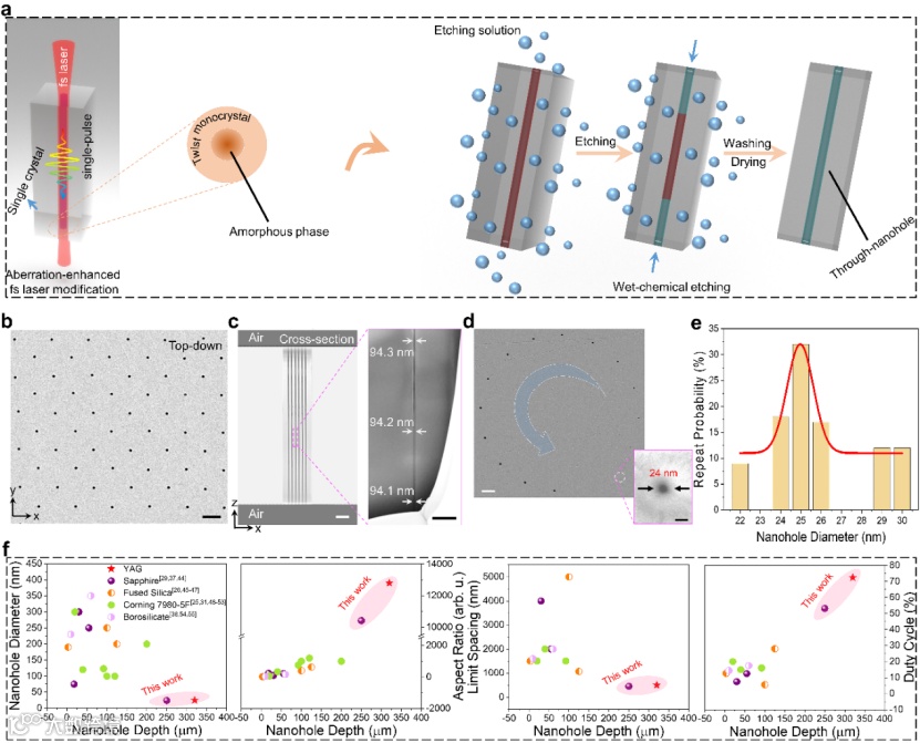 硬脆材料中超小孔径、超高深径比、超大面积的高效纳米结构加工制造,是各种纳米光子结构器件应用一直追求的。通常采用传统光刻工艺,但存在效率低成本高的问题,而且结构特征尺寸难以突破100 nm且深径比难以超越30:1。