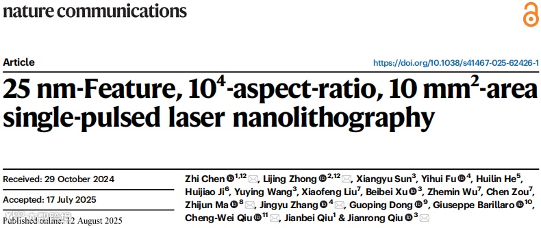 近日,昆明理工大学陈智、邱建备团队第一单位,联合浙大等国内外多家单位,巧妙地利用球差增强效应和非线性限域效应,开发了一种湿化学辅助的单脉冲飞秒激光纳米光刻技术(wet-chemical etching assisted aberration-enhanced single-pulsed femtosecond laser nanolithography: WEALTH),实现了25 nm超小孔径、10⁴:1超高深径比、10 mm²甚至cm²级超大面积的孔洞纳米结构制造,性能和指标远超传统光刻技术。相关成果以「25 nm-Feature, 10⁴-Aspect-Ratio, 10 mm²-Area Single-Pulsed Laser Nanolithography」为题于2025年08月12日在线发表在Nature Communication上。WEALTH的发明对于实现大面积、消色差、宽带可调的超透镜、纳米光子结构器件、纳米生物传感检测器件等具有重要意义。