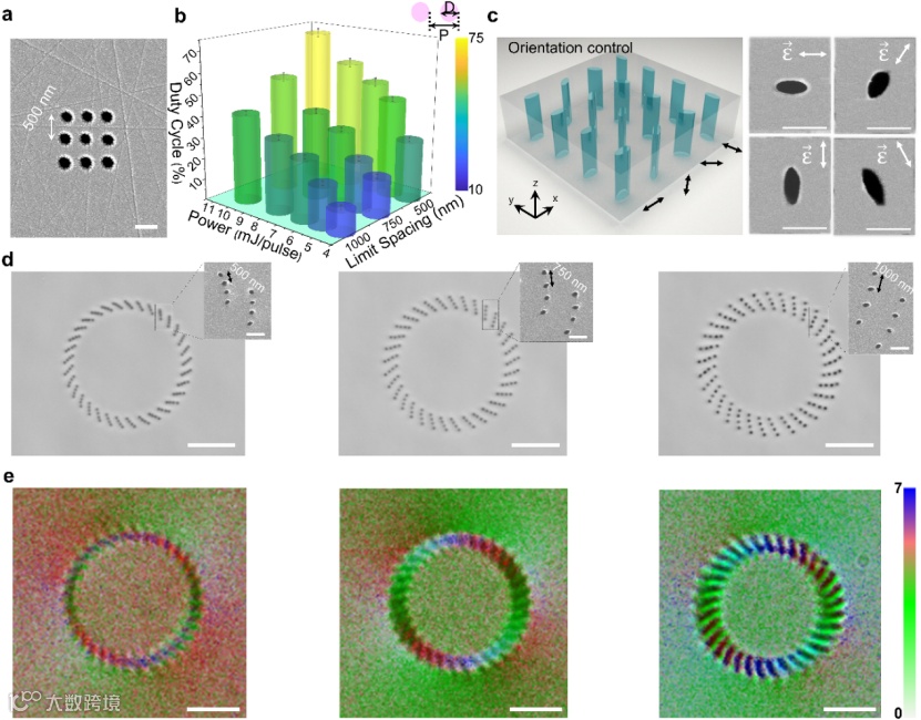 相比之下,WEALTH技术可实现最小间距450 nm(图1f和图2a)、占空比>70%(图2b)的纳米孔加工。此外,由于球差增强的单脉冲飞秒激光与单晶相互作用能量重新分布,我们发现其加工不具有偏振依赖性,非常有利于借助光束整形技术,实现对纳米孔的形状、取向和分布任意操控(图2c-e)。WEALTH技术这种孔洞纳米结构灵活可控性可以应用于新兴的纳米光子结构器件、特异性免疫生物传感探测、超精细纳米切割、3D光子集成和高密度光数据存储等众多应用领域。