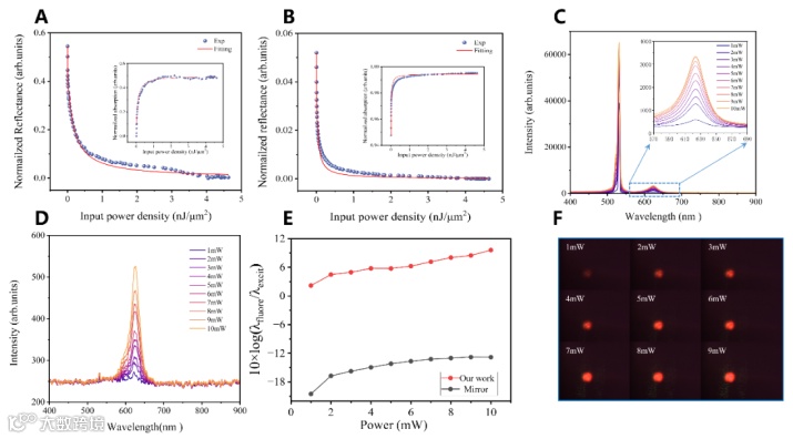 图 5. 基于 GTPP 器件的非线性吸收特性与杂散激光抑制性能。(A) 随入射功率密度增加,2 nm 厚超薄金膜的归一化反射率变化,表现出反饱和吸收(RSA)行为。随着功率密度升高,反射率逐渐降低,而归一化吸收率(插图)增加并最终饱和。测得的RSA 阈值为 9.6×10⁻³ nJ/μm²。(B) GTPP增强的RSA响应, 与裸金膜相比,其阈值显著降低至 7.7×10⁻⁵ nJ/μm²。反射率下降更明显,吸收率(插图)在较低功率密度下即达到饱和,表明非线性等离激元效应得到增强。(C) 采用 532 nm 激光激发 CdSe 量子点的荧光光谱,显示出极强的残余激光干扰,掩盖了 625 nm 的荧光信号(参见光谱测试结果)。(D) 当使用 GTPP 器件替代传统反射镜后,532 nm 激光被完全吸收抑制。(E) 金属反射镜与 GTPP 器件在不同激光强度(1~10 mW)下的消光性能对比。(F) 在 532 nm 激光激发下的 CdSe 量子点荧光成像。经过 GTPP 器件吸收消除激光干扰后的纯荧光图像更清晰、均匀。
