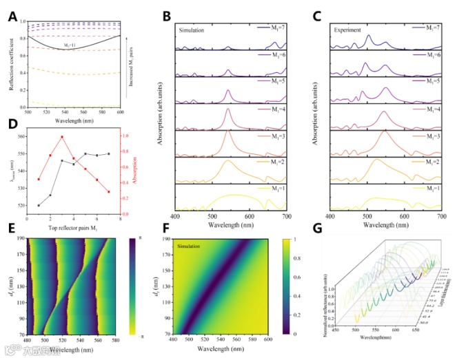 图 3. 通过结构设计调控 GTPP 的特性。(A) 在固定底部 DBR 对数(m₂ = 11)的条件下,计算得到随顶部 DBR 对数(m₁)增加而变化的 2 nm 金属膜反射系数。黑色参考曲线表示超薄金属/DBR 补偿层界面的基准反射系数。(B) 数值模拟得到的吸收光谱,展示了不同顶部 DBR 对数下 GTPP 共振的演化过程。(C) 不同顶部 DBR 对数的 GTPP 器件的实验吸收光谱。(D) 不同顶部 DBR 对数对应的吸收峰位置与吸收效率的定量分析。(E) 计算得到的金属–顶部 DBR 界面反射相位随相位匹配层厚度(70–190 nm)变化的规律。(F) 模拟反射光谱,展示了相位匹配层厚度变化对反射特性的影响。(G) 制备的 14 通道 GTPP 器件阵列的归一化反射光谱,相位匹配层厚度为 30–180 nm,通道间隔约为 11.4 nm。