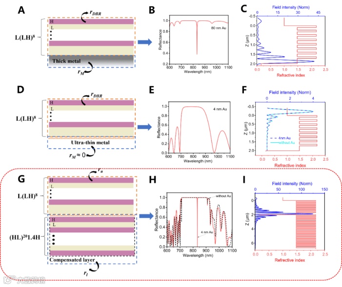 图 1. 利用超薄金属膜实现广义 Tamm 等离激元(GTPP)的设计策略。(A) 厚金属–DBR结构中 TPP 激发的示意图。(B) 厚金属条件下 TPP 激发的反射光谱。(C) 在 (D) 中共振波长 λ = 833 nm 时的折射率分布(红色实线)和电场分布(蓝色实线)。(D) 超薄金属–DBR 结构的示意图。(E) 超薄金属–DBR 结构的反射光谱。(F) 在 (E) 中 λ = 833 nm 时的折射率分布(红色实线)和电场分布(蓝色实线)。(G) 在超薄金属膜的另一侧引入 DBR 补偿层。(H) 加入 DBR 补偿层后展示GTPP的反射光谱。(I) 在 (H) 中共振波长 λ = 833 nm 时的折射率分布(红色实线)和电场分布(蓝色实线)。