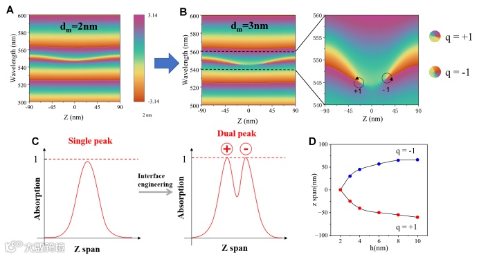 图 4. GTPP 系统中光谱相位奇点(SPS)的拓扑特性(模拟结果)。(A) 厚度为 2 nm 的金属膜在波长–位置(λ–p)空间中的反射相位分布。(B) 随着金属厚度增加(3 nm 情况),λ–p 空间中 SPS 的演化过程。(C) 基于拓扑电荷演化的双峰完美吸收(PA)机制:左图为单吸收峰(无完美吸收)且 SPS 湮灭的情况;右图为伴随生成 q = ±1 拓扑电荷对的双完美吸收峰情况。(D) 介质微腔中拓扑相位奇点电荷随金属厚度变化的演化路径。