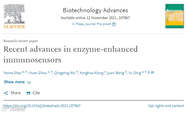 近日,暨南大学丁郁研究员团队在工程技术1区Top期刊Biotechnology Advances (IF=14.227)发表了题为“Recent advances in enzyme-enhanced immunosensors”的综述文章。