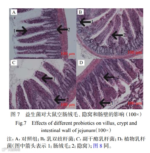 由图7可知,对照组空肠绒毛较细且长度比益生菌组略短一些,隐窝深度也比益生菌组更大一些,肠壁厚度差异并不明显。在所有益生菌组中,乳双歧杆菌组的空肠绒毛较长且排列整齐,隐窝也较浅且肠壁较厚一些。