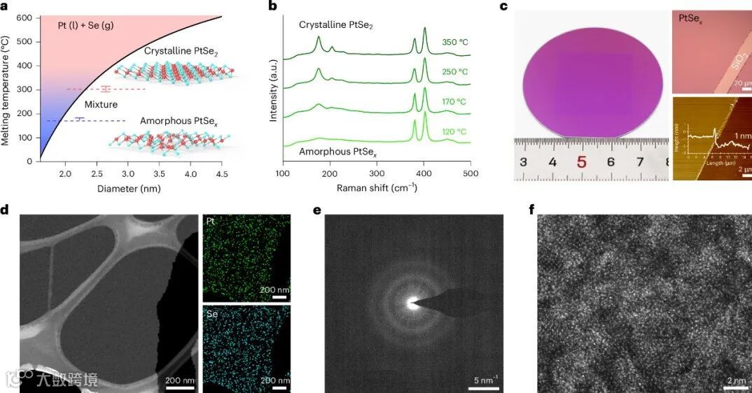另据悉,研究初期他们以为失败的原因是生长温度过高导致 PtSe₂ 的奥斯瓦尔德熟化,所以他们开始逐步降低反应温度进行实验。在极低温(低于非金属 Se 熔点)条件下,虽然未检测到 PtSe₂ 的特征拉曼峰,却观察到 MoS₂ 表面颜色异常加深。秉持“反对本本主义,没有调查就没有发言权”的原则,研究团队进行了更深入和更全面的表征。结果意外发现,在 MoS₂ 表面生长出了接近单层厚度的非晶态 PtSeₓ 纳米带。