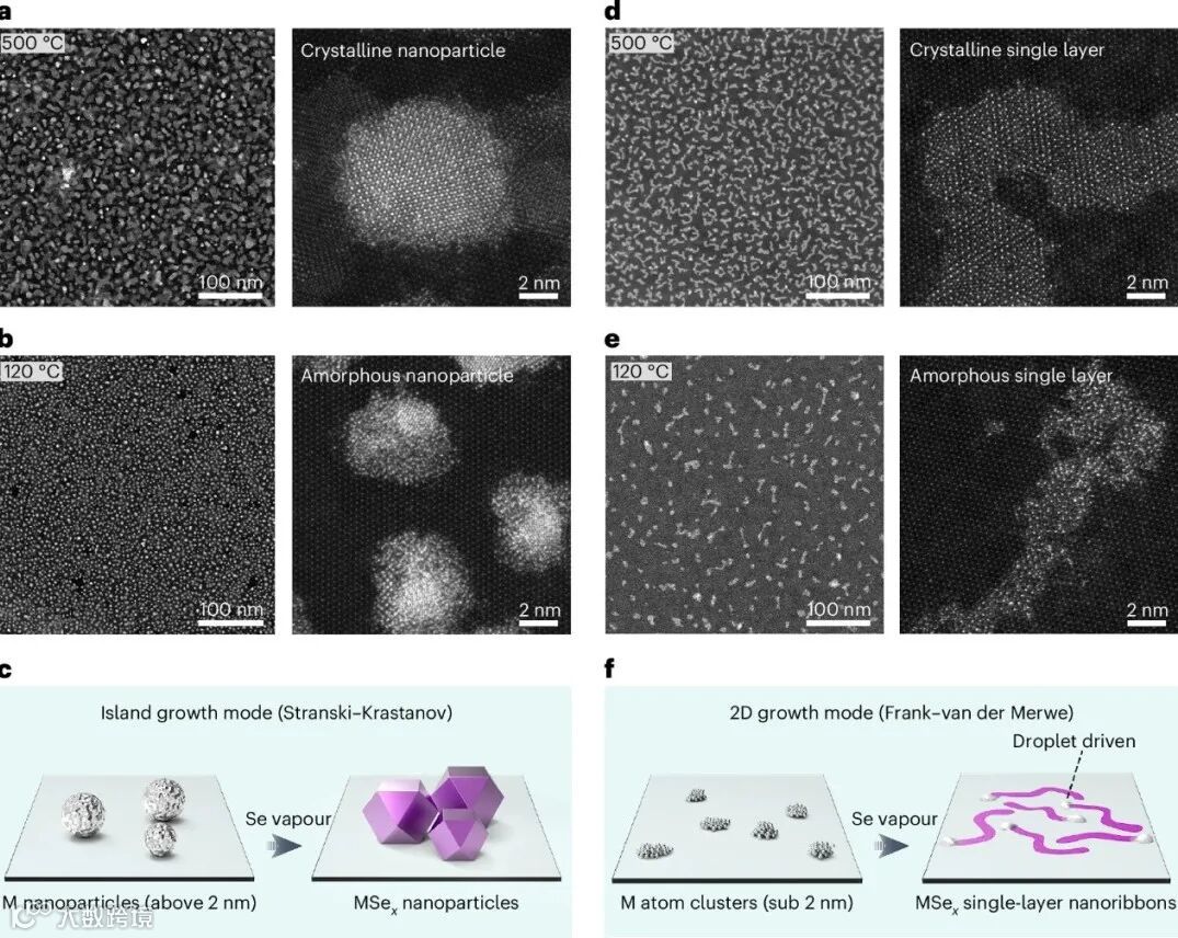 近日,湖南大学教授何勇民团队提出了一种亚 2nm 金属液滴驱动的非平衡动力学生长策略,设计了一个概念验证的实验对比组,借此揭示了决定生长模式的关键变量——驱动生长所用的铂金属团簇尺寸。无论在高温(500℃)还是在低温(120℃)下,当驱动生长所用的铂金属团簇直径 >2nm 时,生长行为均遵循热力学主导的路径,形成了不连续的三维岛状结构。当团簇直径被精确控制在 <2nm 时,生长模式被成功逆转。此时,生长过程由动力学主导,呈现出一种独特的二维平面结构:蚯蚓状的纳米带。